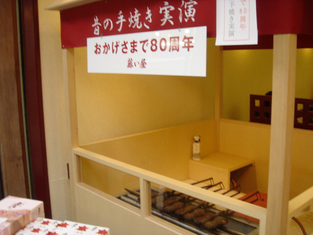 藤い屋さんの手焼のもみじまんじゅうの実演は必ず見られるといいものではないですが、お店の前に手焼用のセットがありますので、見るだけでも面白いと思います。是非、宮島にいったら、出来立てのもみじまんじゅうを。